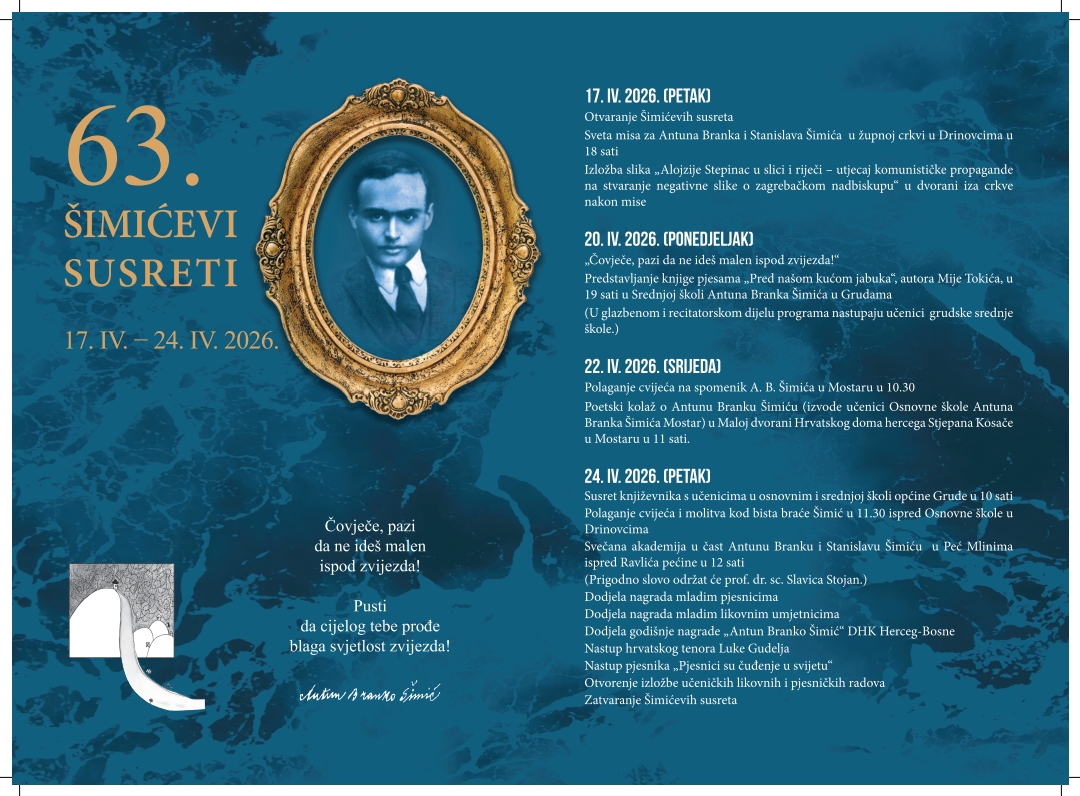Društvo hrvatskih književnika Herceg Bosne i Organizacijski odbor 63. Šimićevih susreta s osobitim zadovoljstvom pozivaju na Književnu tribinu u sklopu 63. Šimićevih susreta 2025., koja će se održati u srijedu, 22. travnja 2026. godine u Mostaru.