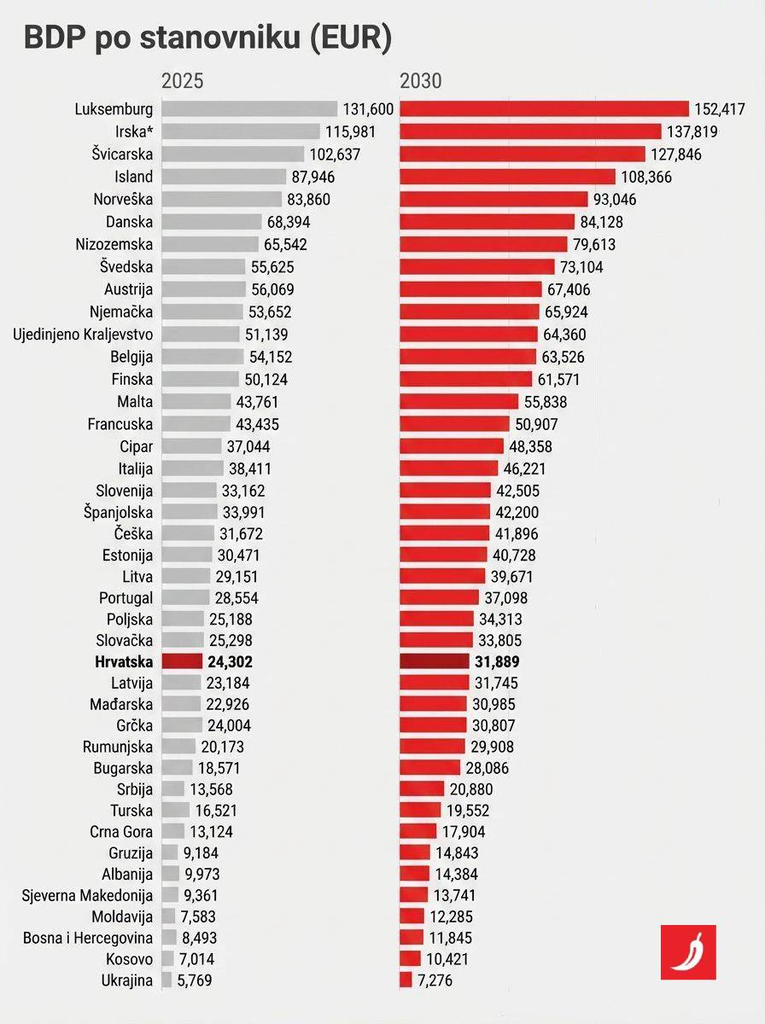 Na vrhu ljestvice razlike su goleme. Irska i Luksemburg izrazito odskaču s predviđenim BDP-om po stanovniku od oko 168.000 eura, odnosno 154.000 eura, izraženim prema paritetu kupovne moći. Slijede ih Norveška i Švicarska, koje bi do 2030. trebale premašiti 106.000 eura.