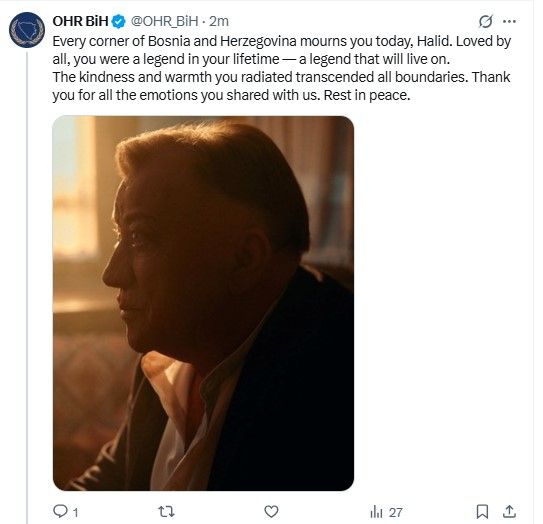 – Svaki kutak Bosne i Hercegovine danas tuguje za tobom, Halide. Voljen od svih, bio si legenda za života – legenda koja će nastaviti da živi, objavljeno je na X profilu ureda visokog predstavnika međunarodne zajednice u BiH