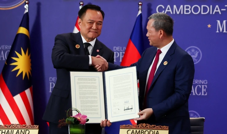 Tajlandski premijer Anutin Charnvirakul i njegov kambodžanski kolega Hun Manet potpisali su sporazum o prekidu vatre ispred znaka na kojem je pisalo “Osiguravanje mira”, koji se temelji na primirju potpisanom prije tri mjeseca.