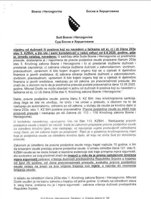 U dopisu Sud objašnjava da mjera sigurnosti, poput zabrane obavljanja dužnosti, predstavlja krivičnopravnu sankciju, te da pravne posljedice osude – prestanak službene dužnosti, zabrana njenog obavljanja i sticanja – automatski nastupaju po pravosnažnosti presude. Time Dodik, kako se ističe, ne može obavljati ni jednu funkciju u organima koji se financiraju iz javnih sredstava.