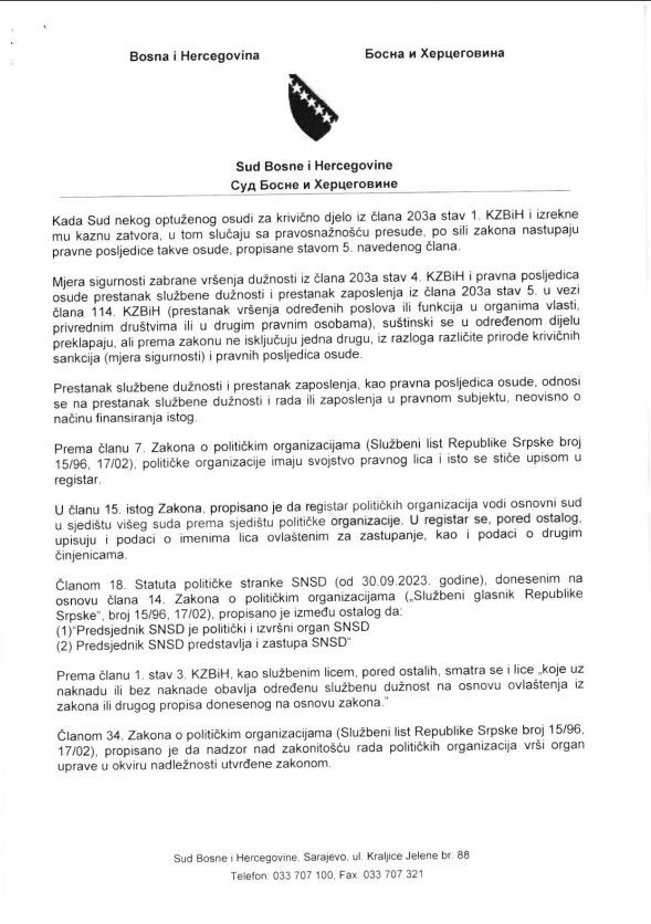 Sud Bosne i Hercegovine uputio je Središnjem izbornom povjerenstvu BiH dopis u kojem ponovo pojašnjava pravne posljedice presude Miloradu Dodiku zbog nepoštivanja odluka visokog predstavnika, navodeći da, po sili zakona, on ne može obavljati funkciju predsjednika SNSD-a.